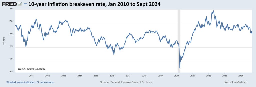 Here is the trend in the 10-year inflation breakeven rate over the last 14 1/2 years, which shows the recent decline from levels nearing 3.0% in April 2022 and then 2.4% in April 2024: