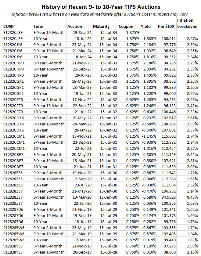 I plan on posting the results after the auction’s close. Meanwhile, here is a history of recent 9- to 10-year TIPS auctions. Notice that less than three years ago the auctioned real yield was -1.145%, the lowest in history for this term: