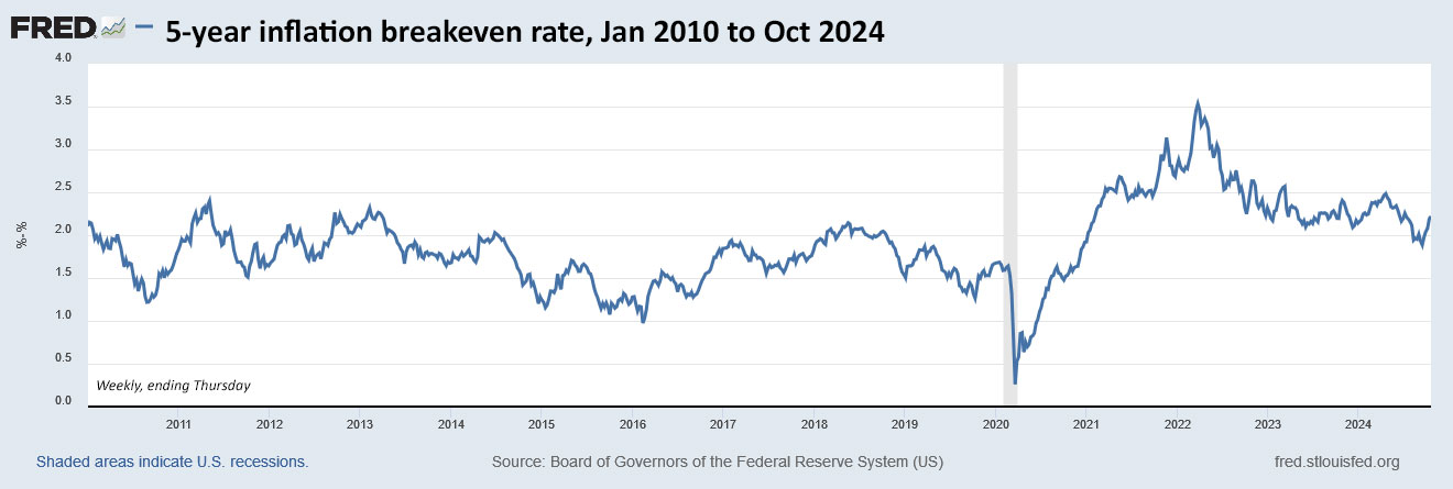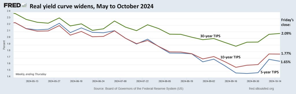 • As of Friday’s market close, the Treasury’s estimate of the real yield to maturity of a full-term 5-year TIPS was 1.65%, up 21 basis points since Oct. 1.