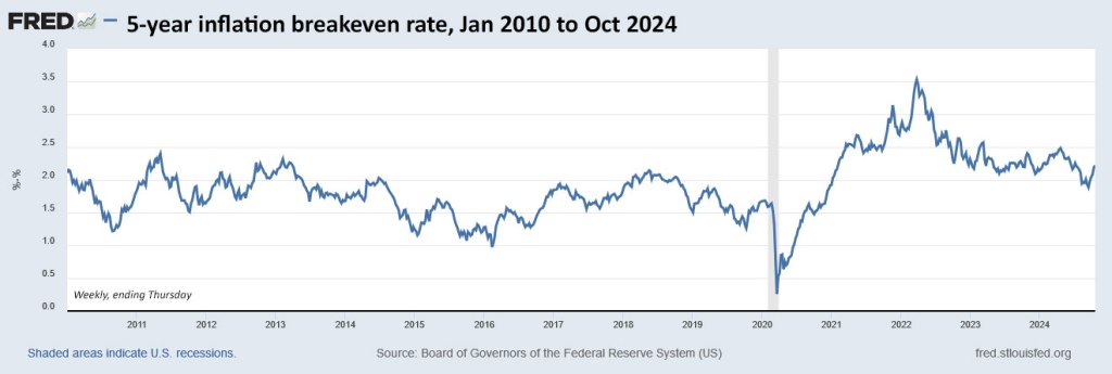 At Friday’s close, a 5-year nominal Treasury note was yielding 3.88%, which at this point indicates an inflation breakeven rate of 2.23% for this new TIPS. That is more or less in line with recent trends. U.S. inflation over the last 5 years has run at 4.2%, but seems unlikely to reach that level over the next 5 years. Or …. maybe it will?