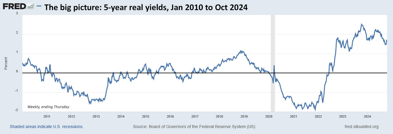 So today the baseline 5-year real yield is hovering around 1.65%, down a whopping 94 basis points since the 2023 high of 2.59% set on October 3. In my view, 1.65% remains historically attractive, as shown in this chart of 5-year real yields over the last 14 1/2 years: