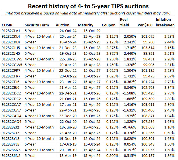 Why is the auctioned real yield of this TIPS likely to be lower than expected? It’s complicated, but real yield expectations are often based on the secondary-market trading of the most recent TIPS of that term. The most recent TIPS of this term is CUSIP 91282CKL4, auctioned on April 18, 2024.