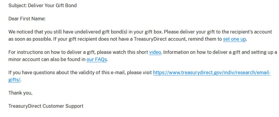 TreasuryDirect this week began sending out emails to investors holding U.S. Series I Savings Bonds in gift boxes, suggesting that these bonds should be delivered “as soon as possible.” Here is what investors are seeing:
