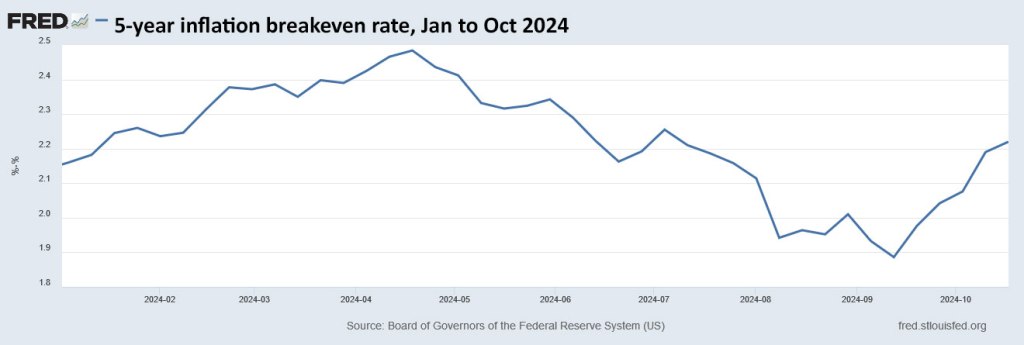 Here is the trend in the 5-year inflation breakeven rate through 2024, showing a recent surge in inflation expectations:
