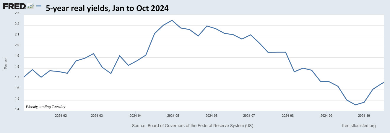 The October auction is always a bit of an outlier. Here is the trend in the 5-year real yield through 2024, showing the sharp decline beginning in May and then reversing in late September: