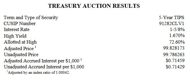 New 5-year TIPS gets a real yield of 1.670% to potentially lukewarm demand