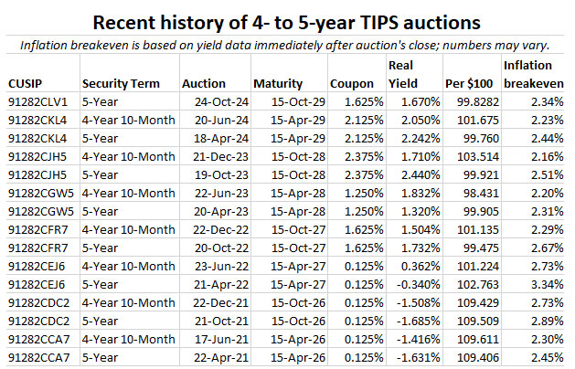 With the nominal 5-year Treasury note trading at 4.01% at the auction’s close, this TIPS gets an implied inflation breakeven rate of 2.34%. I say implied because of the unusual nature of the October auctions. Maybe a better estimate would be around 2.29%. If anyone can find a more-official number, let me know.