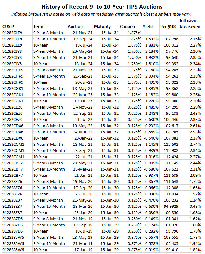 Now, two months later, the 10-year real yield has surged to 2.10%. CUSIP 91282CLE9 trades on the secondary market, and this weekend I am seeing price quotes right in the 2.10% range. Of course, things will change a bit before Thursday’s auction. An investor in this TIPS can also buy it at any time on the secondary market, of course.