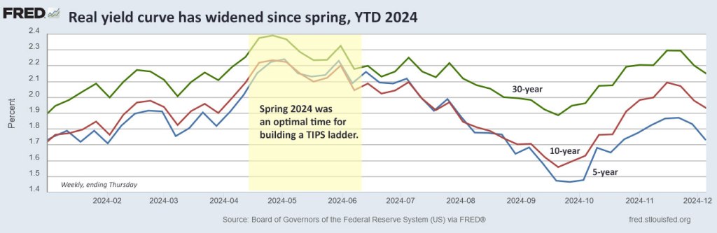 I highlighted the middle section of this chart, spring 2024, to show an optimal time for building a long-term ladder of TIPS investments. It is unusual to see high yields packed in a tight pattern. Investors could purchase individual TIPS of just about any maturity, 5 to 30 years, and get a real yield higher than 2.0%, a historically desirable number. See my post from June 9 and a more recent update on Nov. 10.