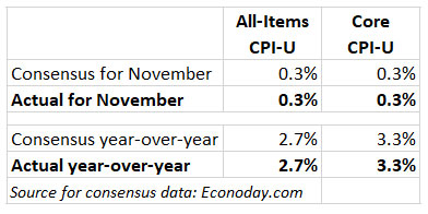 The U.S. Bureau of Labor Statistics reported this morning that both all-items inflation and core (which excludes food and energy) rose 0.3% in November. Those increases matched economist expectations, which – surprisingly – have been fairly accurate recently.