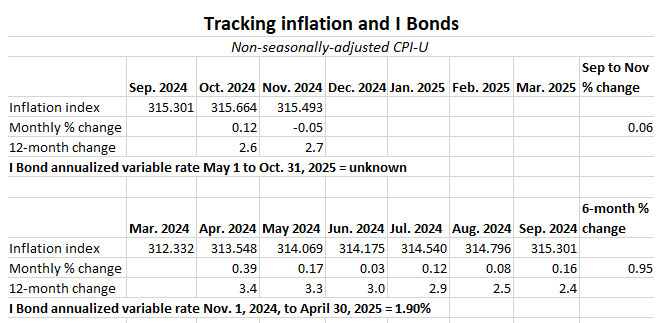 For I Bonds. The November inflation report is the second in a six-month string that will determine the I Bond’s new variable rate, which will be reset May 1. So far, after two months, inflation has increased just 0.06%, which would translate to a variable rate of just 0.12%. This is meaningless. It’s too early to make any assumptions. Here are the data: