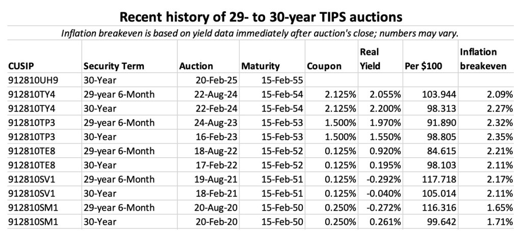 So OK, let’s try to focus on this week’s auction of a new 30-year Treasury Inflation-Protected Security, CUSIP 912810UH9. This is a new TIPS, so its coupon rate and real yield to maturity will be set by the auction results.