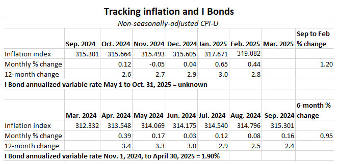 This trend is going to make I Bonds an interesting investment in 2025, potentially offering a composite rate of about 4.1% or 4.2% for six months, at a time when short-term rates could be declining. I’ll have more on that after the March inflation report is issued on April 10. Here are the data so far: