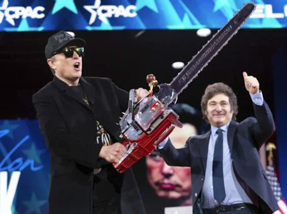 Milei, a self-described “anarcho-capitalist,” is famous for wielding a chainsaw in public (and for giving one to Elon Musk recently at a Conservative Political Action Conference in the U.S.). He told that group: “The only rational path is to shrink the size of the state as much as possible.”