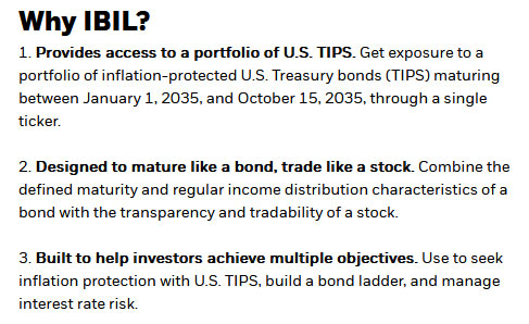 The formal name is the “iShares iBonds Oct 2035 Term TIPS ETF,” going by the ticker IBIL. The goal is simple: To track the performance of U.S. Treasury Inflation-Protected Securities maturing in 2035. Later this year IBIL will add a second TIPS, to be issued in July, and then add two more 5-year TIPS to be issued in April and October 2030.
