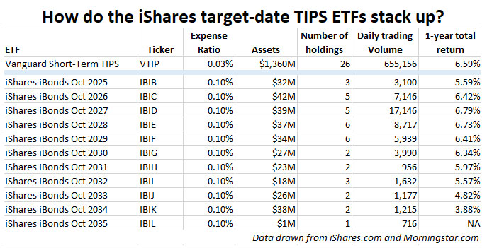 Because the expense ratio is just 0.10%, I really have no problem with using these funds as an alternative to buying individual TIPS. You could quickly build a ladder through 2035 in 15 to 30 minutes, assuming the small daily volume doesn’t create issues.
