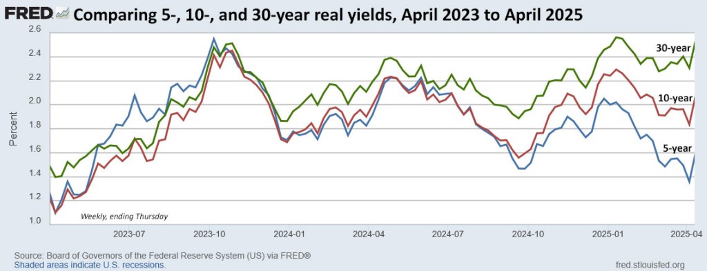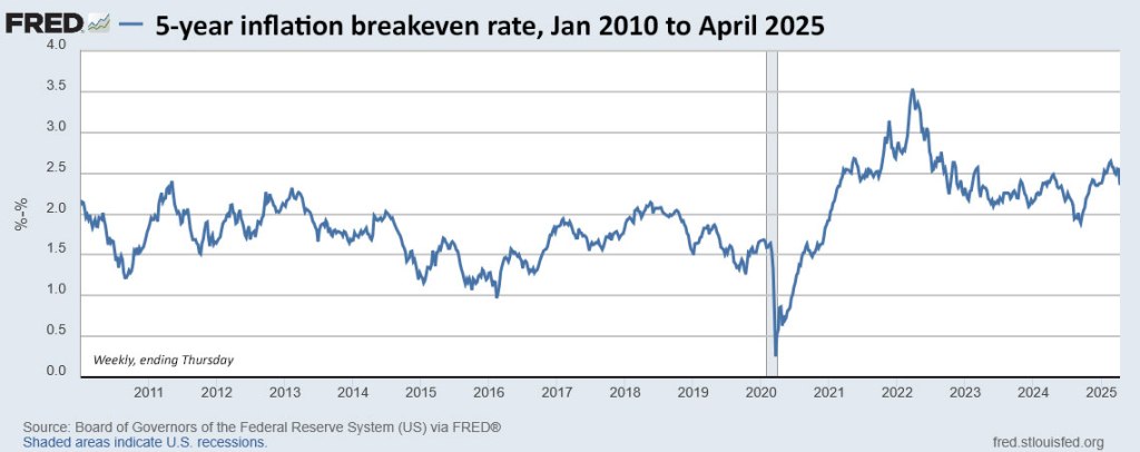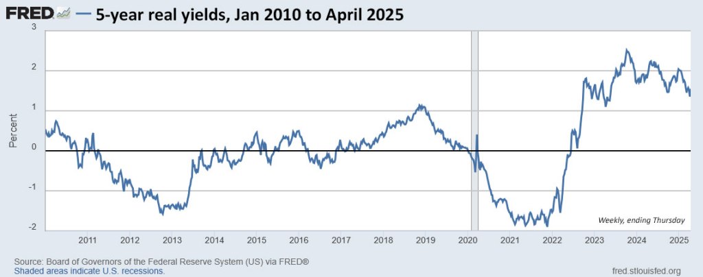But keep this in mind: In chaotic April 3 trading after “Liberation Day” the 5-year TIPS real yield dropped as low as 1.12% midday, and closed that day at 1.25%. It has since increased 57 basis points. So when (or if) things settle down, where will it be?