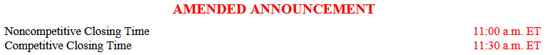 The auction closing time has been changed to 11 a.m. ET for noncompetitive bids and 11:30 a.m. ET for competitive bids: Treasury amended announcement