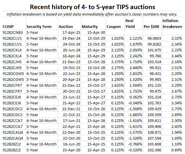 With the 5-year Treasury note closing Friday with a nominal yield of 4.15%, this TIPS currently would have an inflation breakeven rate of 2.33%, close to the result of recent auctions. This means it would outperform the 5-year nominal Treasury if inflation averages more than 2.33% over the next five years. Seems fair. Inflation over the last 5 years, ending in March, has averaged 4.4%.