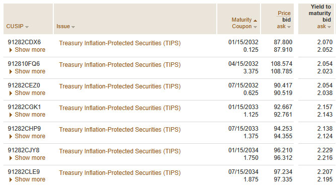 By extending the TIPS maturity out a bit, an investor can find real yields topping 2%. Here are some weekend examples from Vanguard’s trading platform for TIPS maturing from 2032 to 2034: