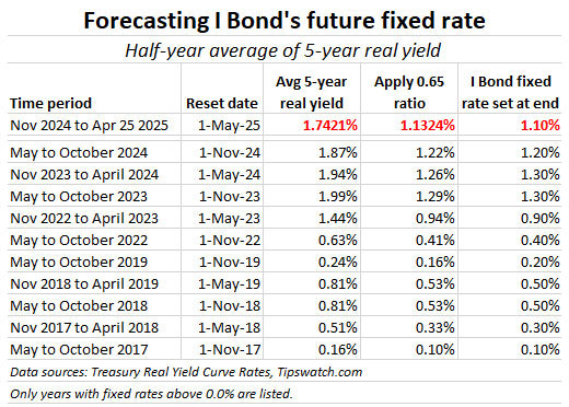 The fixed rate. The Treasury has not revealed a method for setting the I Bond’s fixed rate. But over the last decade, it appears to have leaned heavily on this formula for setting the I Bond’s new fixed rate: Apply a ratio of 0.65 to the average 5-year TIPS real yield over the preceding six months. It seems to have held to that formula for this reset: