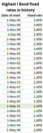 The chart shows all the times in history, dating back to September 1998, that the I Bond’s fixed rate was 1.0% or higher. While May 2025 is low on this list, note that only four of these high-level resets happened in the last 17 years.