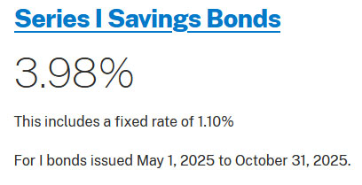 • The I Bond’s current composite rate is now 3.98%, annualized, for a full six months for any bond purchased from May to October 2025. That is an increase from 3.11% for I Bonds purchased in April.