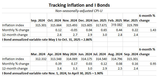 • The inflation-adjusted rate (often called the variable rate) changes each six months to reflect the running rate of inflation. That rate is now set at 2.86%, based on inflation of 1.43% from October 2024 to March 2025. This new rate applies to all I Bonds, no matter when they were issued. (However, the effective start date of the new interest rate will vary depending on the month you bought the I Bond.)