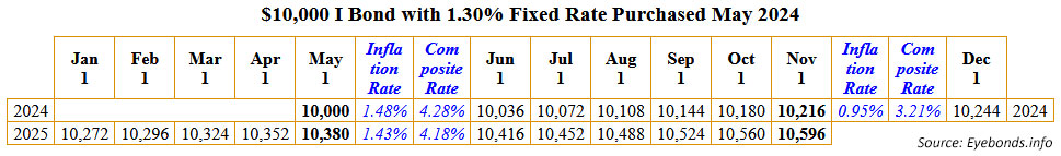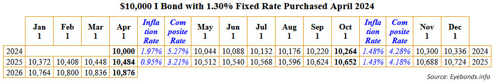 If you bought an I Bond in April 2024 with a fixed rate of 1.30%, it will be earning a composite rate of 3.21% from April to September 2025, before transitioning to 4.18% for October 2025 to March 2026.