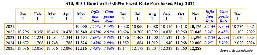 This same rate formula applies to all I Bonds, no matter when they were issued. If the fixed rate is 0.0%, then the composite rate is simply the current variable rate. So, for example, an I Bond issued in May 2021 with a fixed rate of 0.0% will be earning 2.86% from May to October 2025: