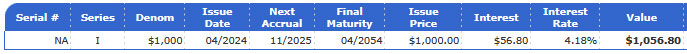 For this I Bond, if you set the “value as of” October 2025 you will get the same composite rate, 4.18%. If you try to enter a “value as of” November 2025, the SBC will give you “NA,” because it does not yet know the next variable rate.