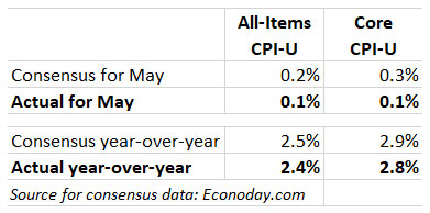 Core inflation, which strips out food and energy, also increased 0.1% and at an annual rate of 2.8%, down from 2.9% for April. All of these results were below economist expectations and should be viewed positively today by financial markets.