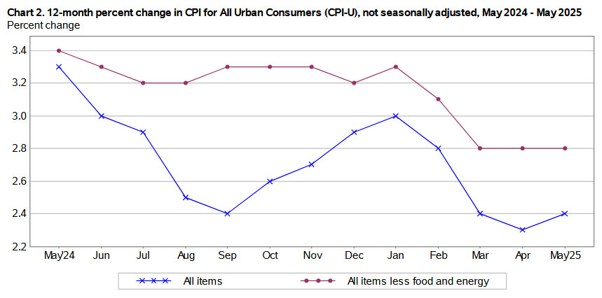 U.S. inflation continued rising at a moderate rate in May, with all-items prices increasing only 0.1% on a seasonally adjusted basis, the Bureau of Labor Statistics reported today. The annual inflation rate for May increased to 2.4%, up from 2.3% in April.