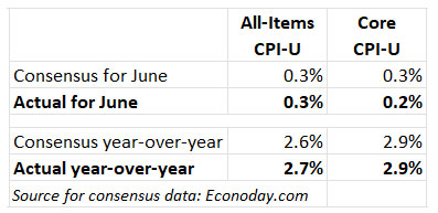 As economists expected, U.S. all-items inflation moved higher in June, up 0.3% for the month and 2.7% year over year, well above the annual rate in May of 2.4%, the Bureau of Labor Statistics reported.