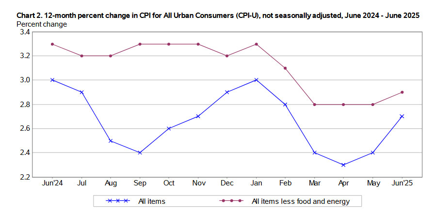The monthly increases may be showing some effects of U.S. tariffs, but the annual increases can also partly be explained by weak inflation a year ago in June 2024, which surprisingly dipped into deflation at -0.1%. So this year’s annual increase can partly be explained by that low base number a year ago.