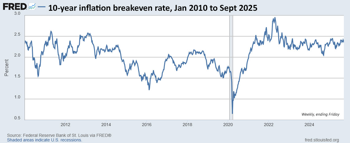 Here is the trend in the 10-year inflation breakeven rate over the last 15 years, showing the fairly stable pattern since the closing months of 2022: