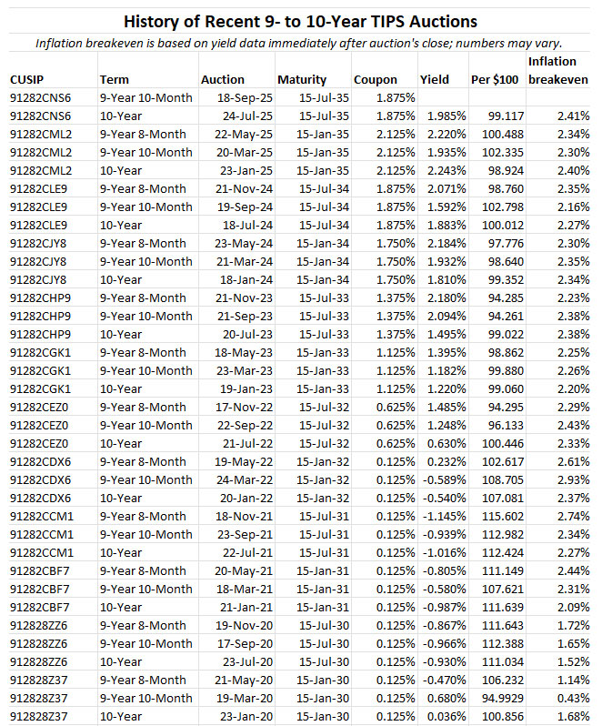 The 10-year Treasury note closed Friday with a nominal yield of 4.06%, giving this TIPS a current inflation breakeven rate of 2.37% –in line with recent auctions of this term. That means CUSIP 91282CNS6 will out-perform a nominal 10-year if inflation averages more than 2.37% over the next 9 years, 10 months. Inflation over the last 10 years, ending in August, has averaged 3.1%.
