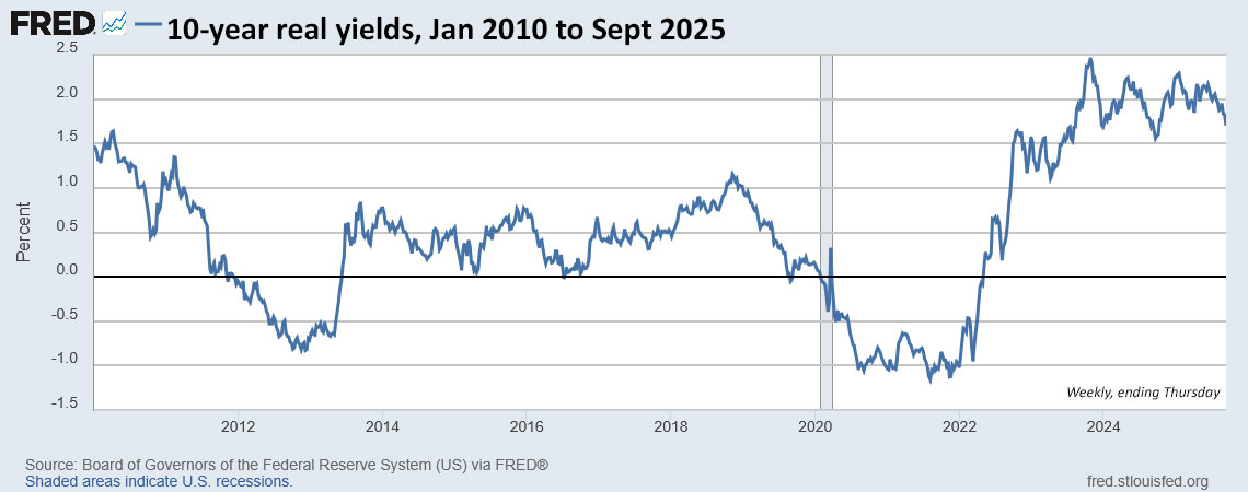 The chart shows that the current real yield of 1.69% remains historically attractive, but has fallen well off the October 2023 high of about 2.55%.