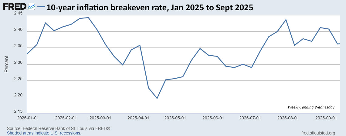 Here is the trend in the 10-year inflation breakeven rate year-to-date. Inflation expectations have been rising since tariff disruptions complicated things in April: