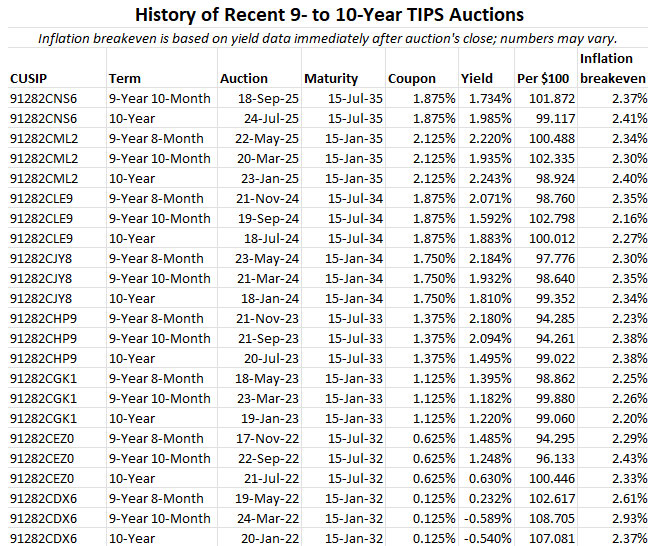 Nevertheless, 10-year real yields have fallen sharply through much of 2025. The originating auction for this TIPS got a real yield of 1.985% on July 24. Its coupon rate was set at 1.875% by that auction.