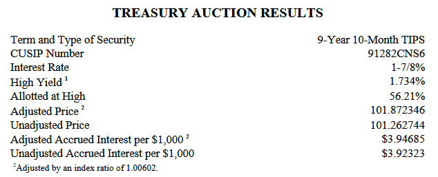 The auctioned real yield to maturity for this 9-year, 10-month TIPS ended up at 1.734%, well above the “when-issued” market prediction of 1.684%. This TIPS had been trading on the secondary market with a real yield of 1.69% just before the auction’s close.