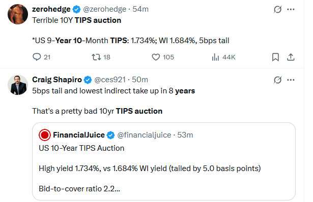 Today, the market real yield heading into the auction was 1.69% but the auction ended up at 1.734% — it was higher than the market because of weak demand. But it was still below the previously-set coupon rate.