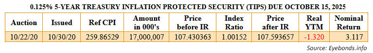 Back on October 22, 2020, a new 5-year Treasury Inflation-Protected Security — CUSIP 91282CAQ4 — auctioned with a depressingly low real yield to maturity of -1.320%, which at the time was the second-lowest real yield ever recorded for a 5-year TIPS at auction.