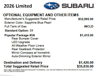 So in theory, Subaru cut the price of the non-hybrid 2026 Limited. But in reality, it was a price increase. If you added in the cost of the unavailable moonroof and upgraded sound system, the sticker price would increase from $35,830 to $37,625, about 2.5%.