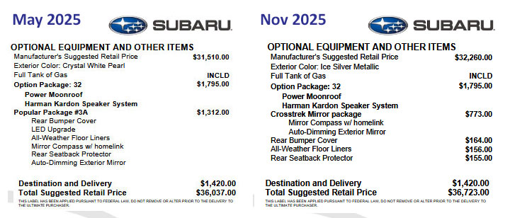 After “Liberation Day” on April 2, I began tracking sticker prices for the Crosstrek Limited to see how tariffs could effect the purchase price. The current U.S. tariff on Japanese car imports is 15%, but this Limited model is assembled in Lafayette, Indiana, so the effect of tariffs could be somewhat muted. Here is a sticker price comparison, May to November 2025:
