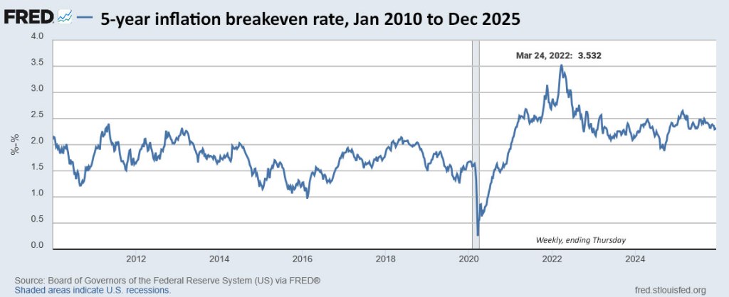 Here is the trend in the 5-year inflation breakeven rate over the last 15 years, showing the strong surge higher in 2022 and more recently, a slight dip: