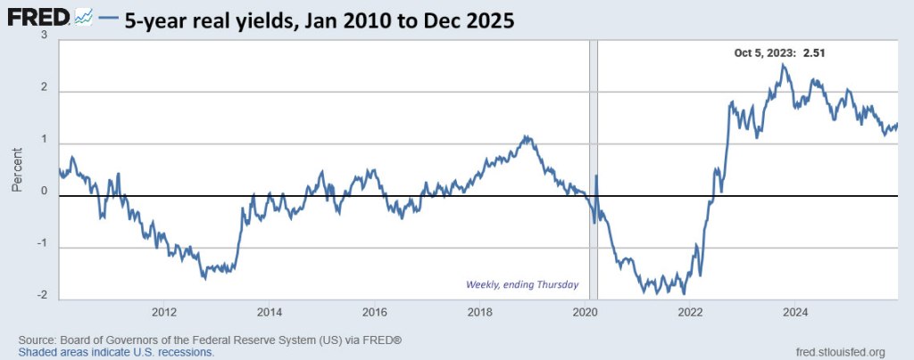 Is a real yield of 1.40% attractive? Historically, yes, but it is well below the high of about 2.51% set in October 2023. Here is the trend in the 5-year real yield over the last 15 years: