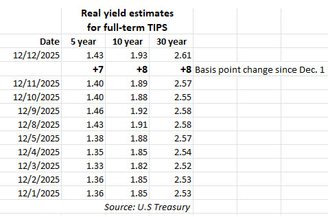 Normally, the 5-year real yield will track lower or higher to match the Federal Reserve’s rate decisions. The 5-year is the shortest term of auctioned TIPS and so its yield generally follows along with the Fed’s December decisions on short-term rates. But not this year. The 5-year real yield has increased 7 basis points since December 1 and 3 basis points since the Fed’s announcement on December 10.