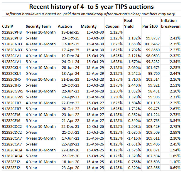 With the 5-year Treasury note closing Friday with a nominal yield of 3.75%, this TIPS currently has an inflation breakeven rate of 2.35%, a bit below recent auctions of this term. It means this TIPS will outperform the nominal Treasury if inflation averages more than 2.35% over the next 4 years, 10 months. (I’d take that bet.)