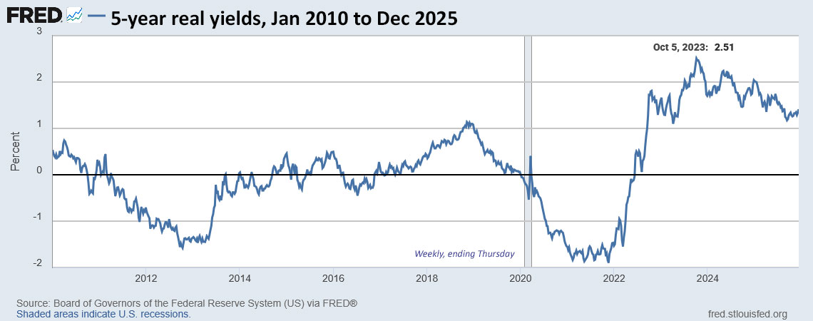 Is a real yield of 1.40% attractive? Historically, yes, but it is well below the high of about 2.51% set in October 2023. Here is the trend in the 5-year real yield over the last 15 years: